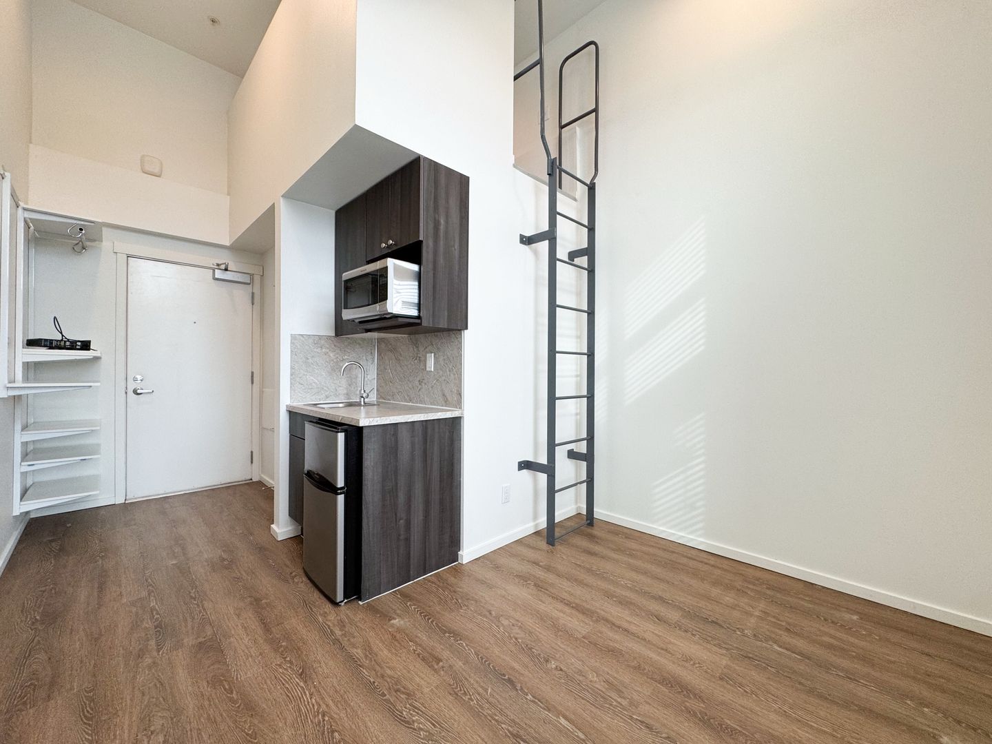 Welcome to Apartment 503 – a stunning, spacious loft-style retreat perched on the top floor, offering the ultimate in urban living! This unique home combines modern design with unparalleled versatility, featuring an innovative layout that maximizes both style and functionality. The main level boasts a sleek kitchenette and a private bathroom, while a ladder leads you to an elevated living space perfect for creating a cozy sleeping nook, a private office, or whatever your imagination desires. The separation of spaces opens up endless possibilities for customization, making this loft truly one-of-a-kind.
