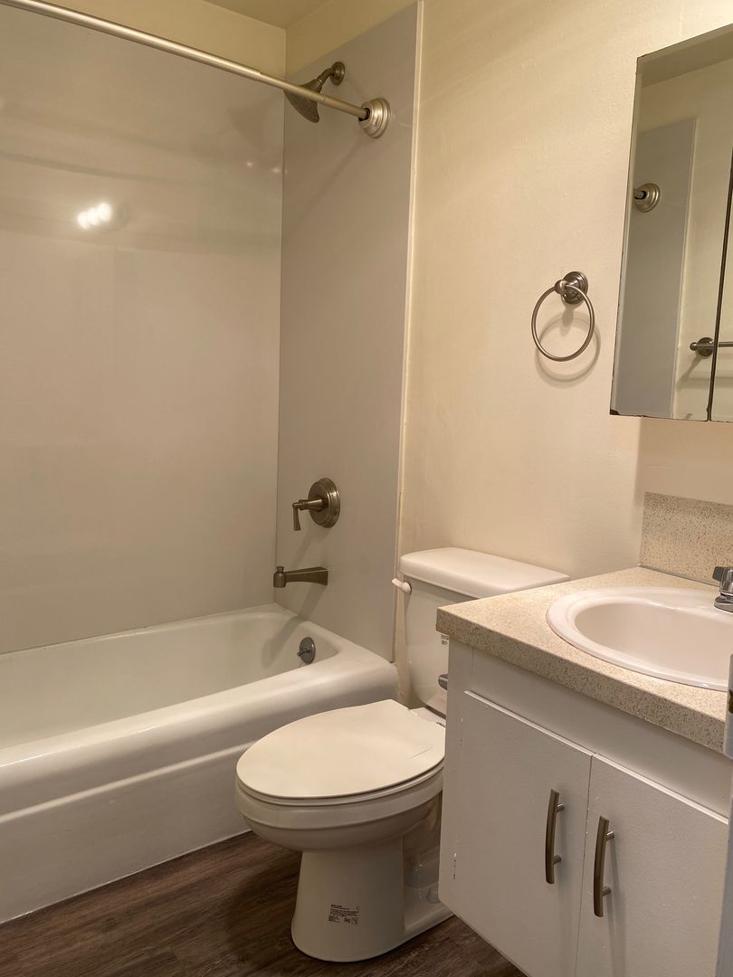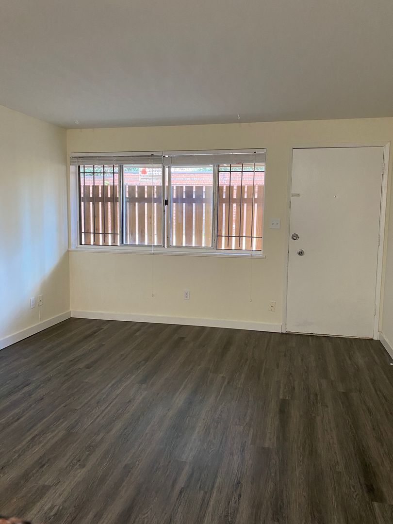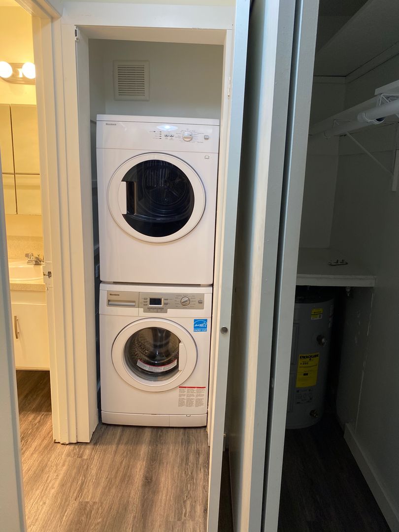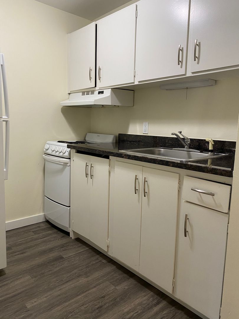 Ground floor studio apartment with exterior access in a 17-unit building in Capitol Hill. Large living space with LVP plank flooring with divider for kitchen area, a full bath and washer and dryer in unit and a spacious closet.