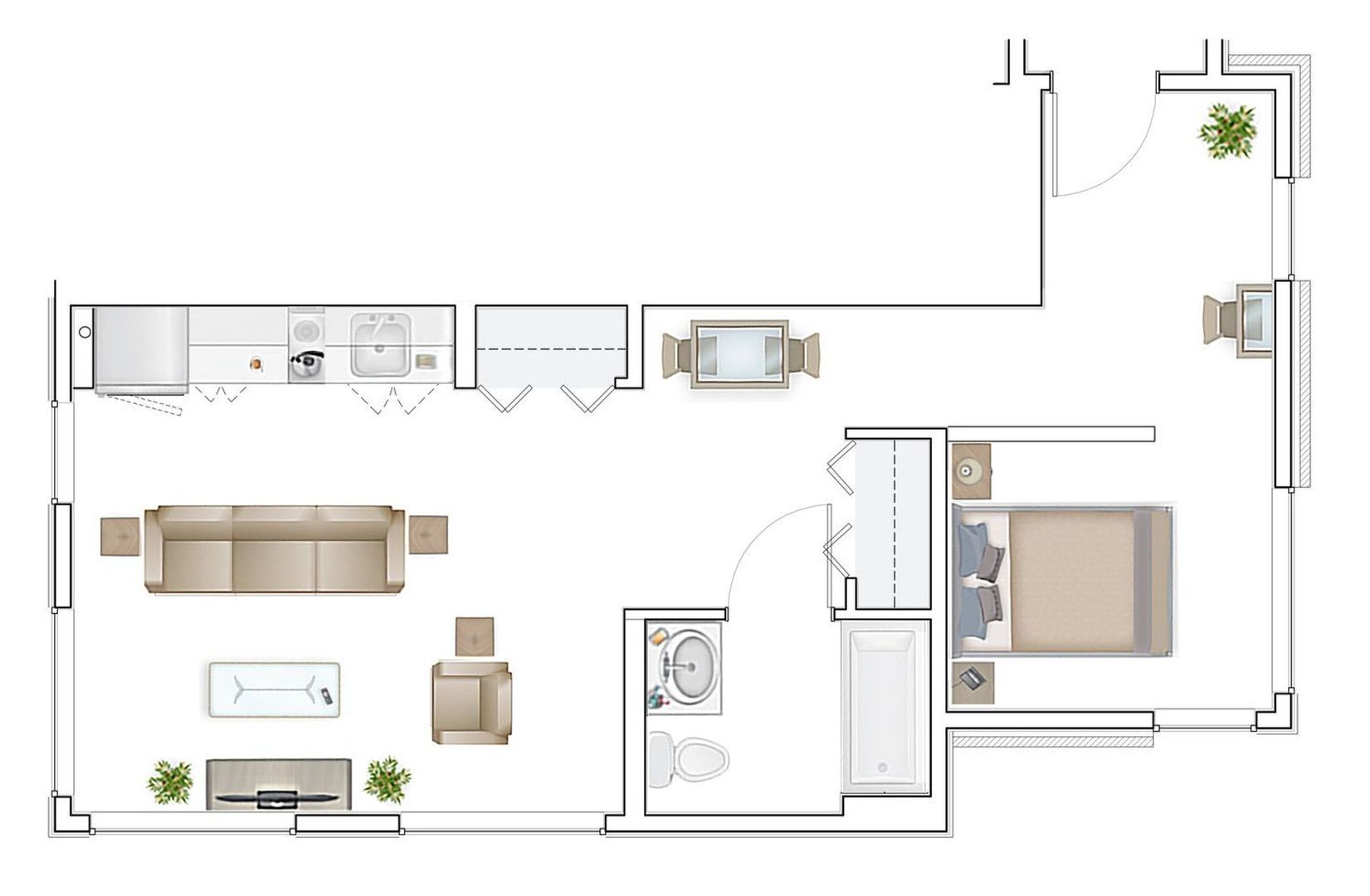 Unit 401 is a rare corner home with east, south, and west exposure, plus a smart open one‑bedroom layout with natural separation between living and sleeping areas.