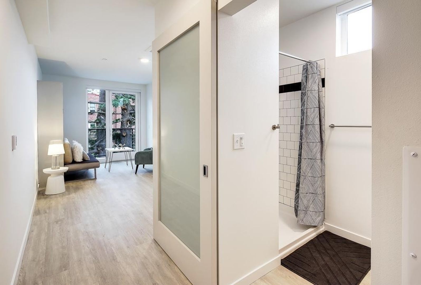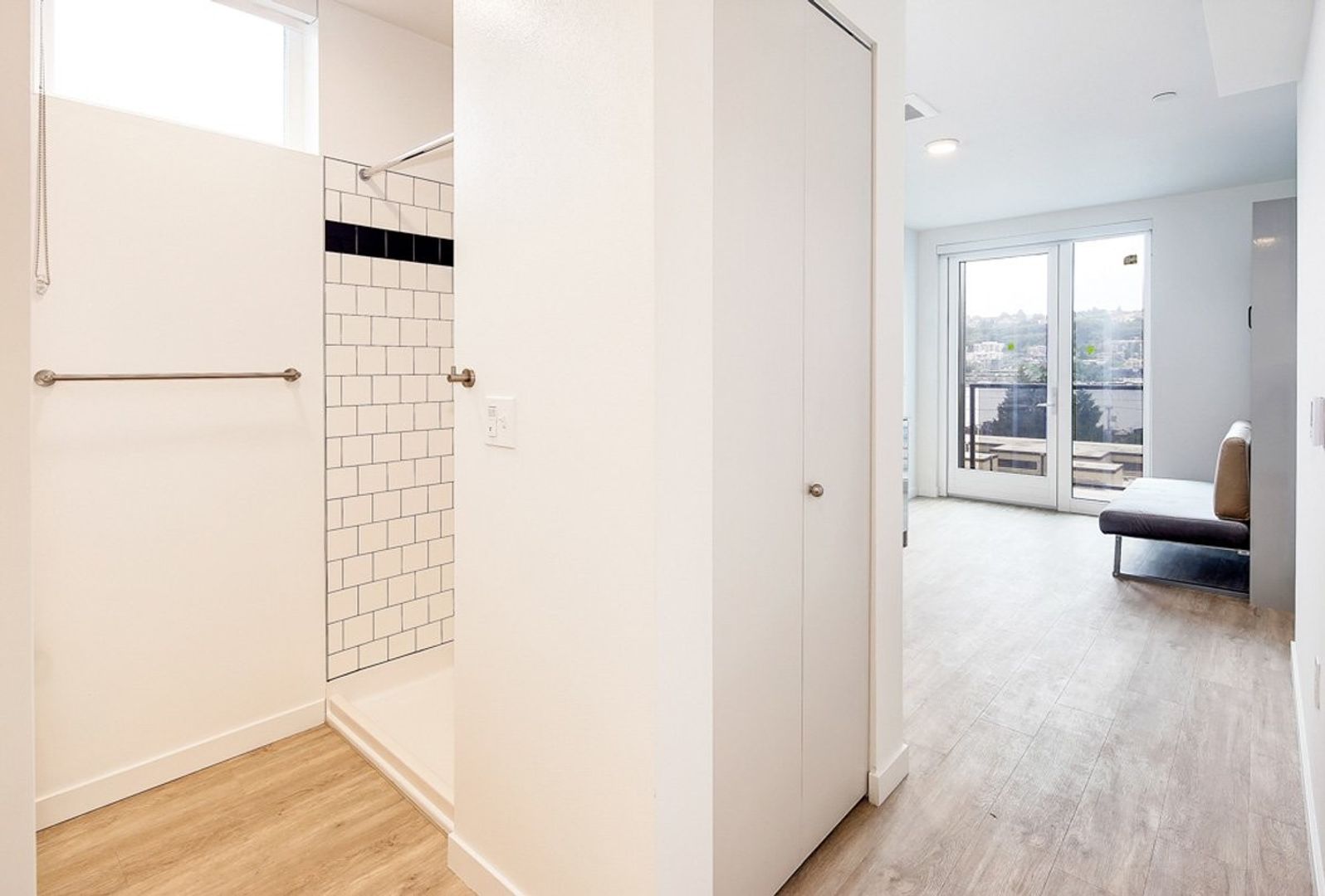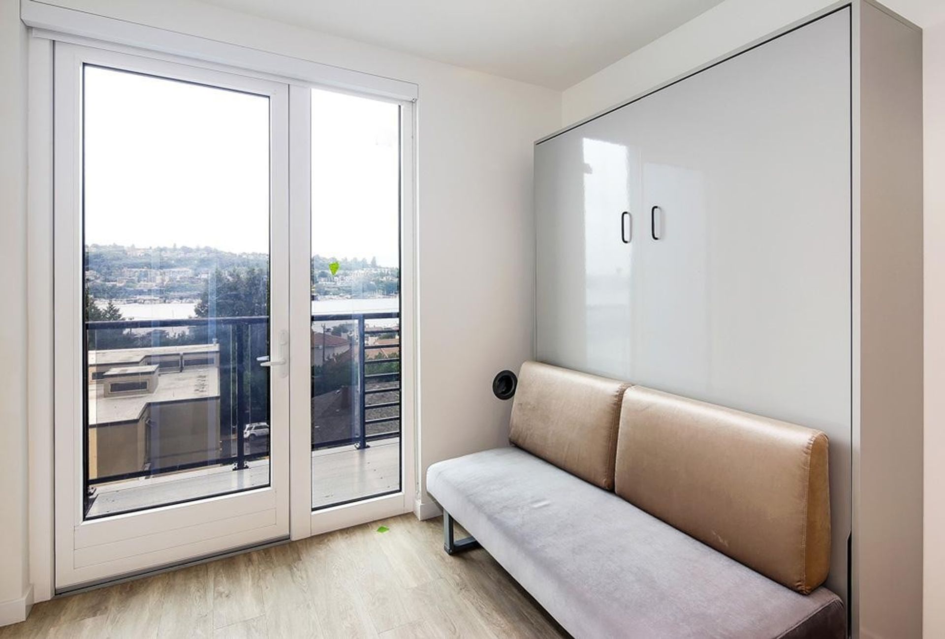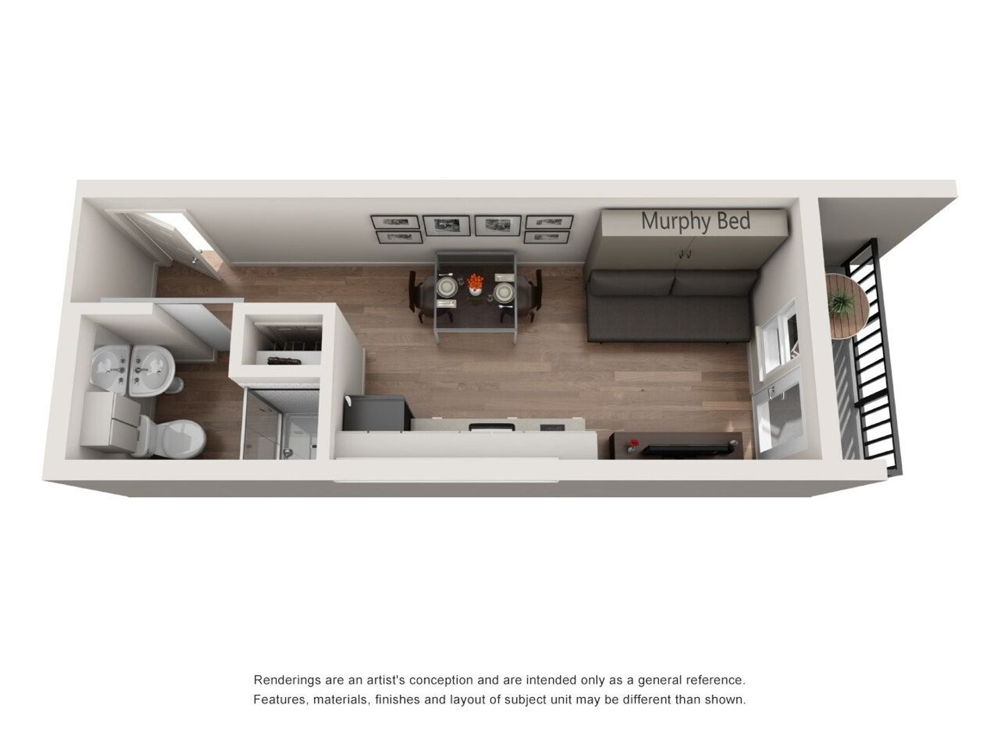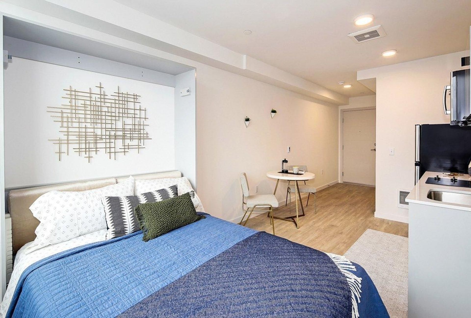 Furnished with a convertible Murphy Bed (which fits a full-sized mattress, not included) and chic love seat in select units. *Murphy Bed has been removed in some units.