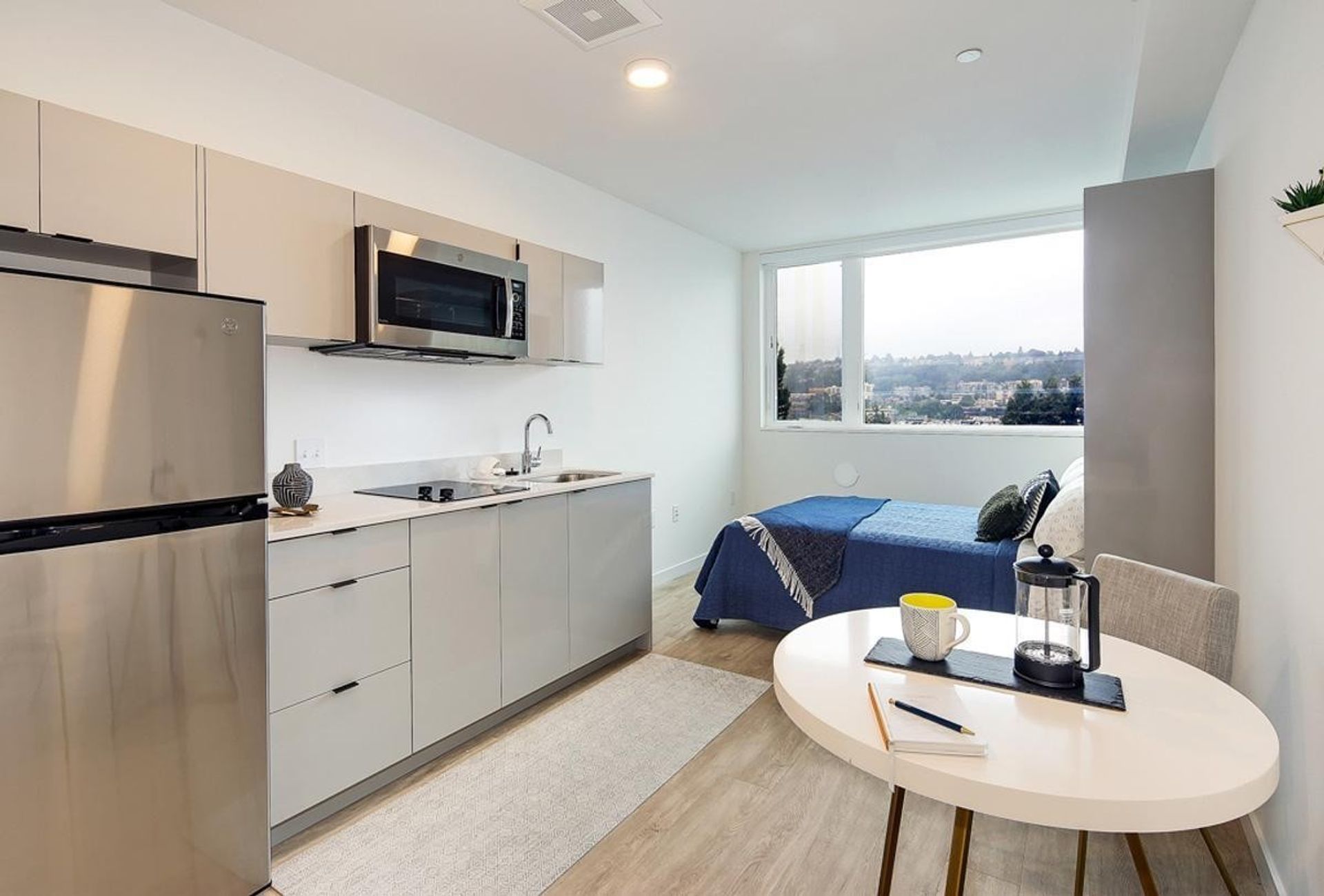 Welcome to Yale! Modern studio with stylish finishes located in the Eastlake neighborhood with restaurants nearby, close to South lake Union and Downtown. Bus lines to University District, Capitol Hill and more. Gorgeous rooftop deck with incredible views of downtown, lake Union and gas works. This apartment has a kitchenette with stove top, refrigerator and convection microwave; bathroom with shower; and Murphy bed. Bright modern finishes. Pets okay.