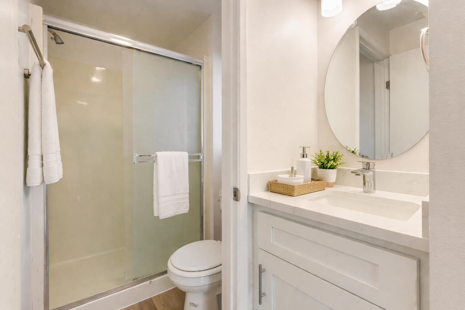 The modern kitchen offers stainless steel appliances, quartz countertops, sleek white cabinetry, and a breakfast bar ideal for casual dining. Enjoy cozy evenings by the wood-burning fireplace, the convenience of a brand-new washer and dryer in-unit, and a private patio with scenic views, perfect for your morning coffee. Both bedrooms are spacious, with the primary bedroom offering dual closets, and en ensuite bathroom, for added comfort and privacy.