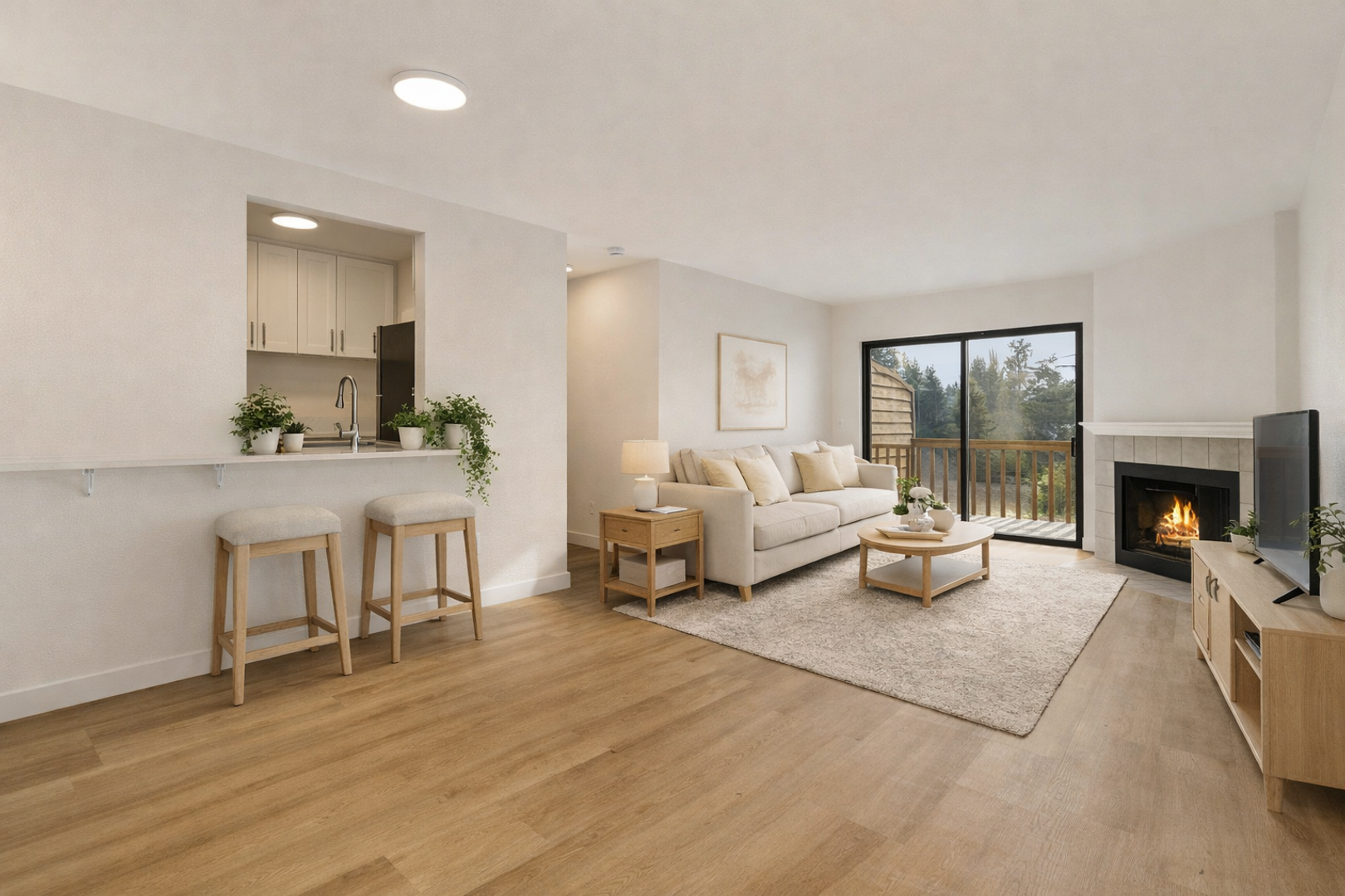 The modern kitchen offers stainless steel appliances, quartz countertops, sleek white cabinetry, and a breakfast bar ideal for casual dining. Enjoy cozy evenings by the wood-burning fireplace, the convenience of a brand-new washer and dryer in-unit, and a private patio with scenic views, perfect for your morning coffee.