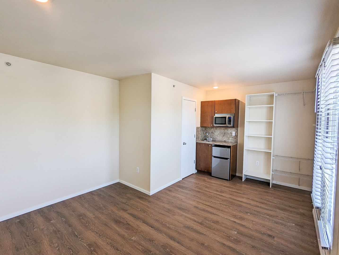 Unit 501 is located on the top floor, close to the common kitchen and laundry facilities. East facing windows and a Juliet balcony provide plenty of light for this spacious 270+ square foot studio.