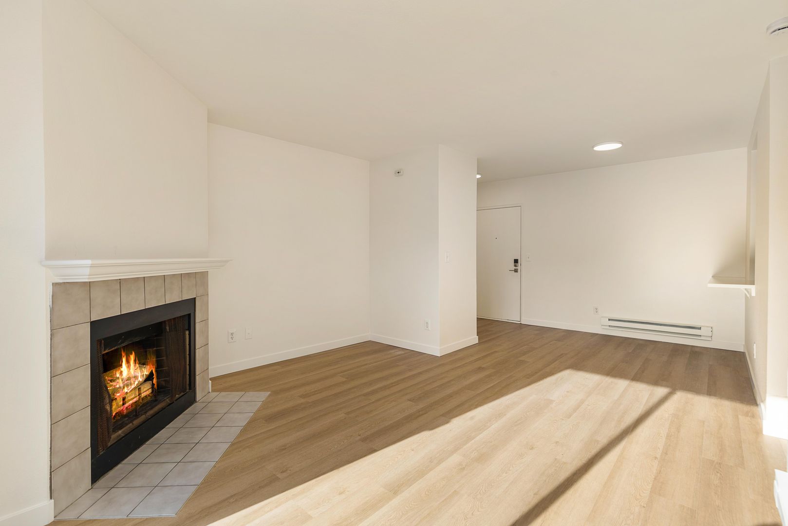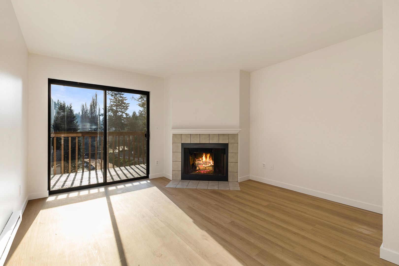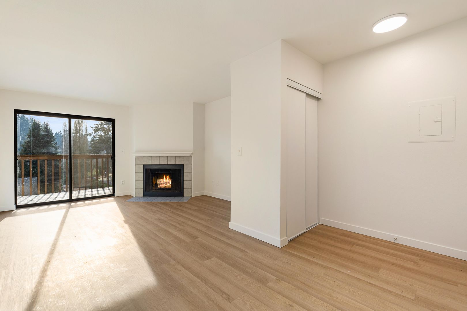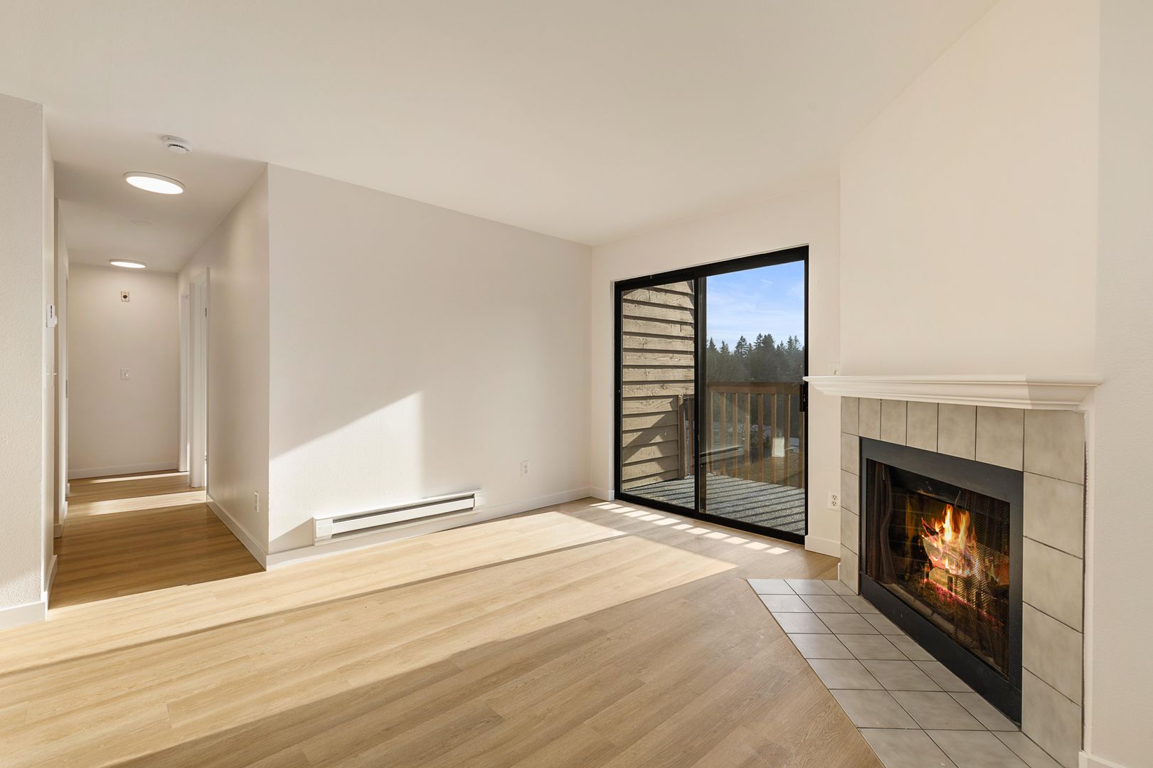 The modern kitchen offers stainless steel appliances, quartz countertops, sleek white cabinetry, and a breakfast bar ideal for casual dining. Enjoy cozy evenings by the wood-burning fireplace, the convenience of a brand-new washer and dryer in-unit, and a private patio with scenic views, perfect for your morning coffee. Both bedrooms are spacious, with the primary bedroom offering dual closets, and en ensuite bathroom, for added comfort and privacy.