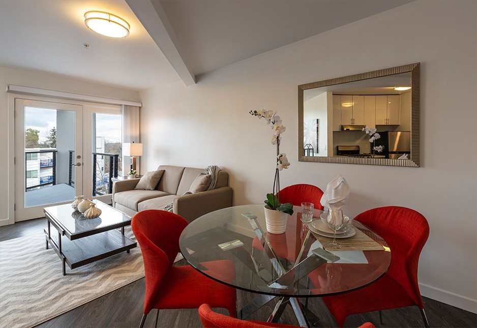 Each apartment includes a beautiful and fully-equipped kitchen with contemporary finishes, stainless appliances, and dishwasher, as well as vinyl-wood flooring and floor-to-ceiling windows throughout! This stunning top floor corner unit also offers a spacious private balcony with INCREDIBLE MOUNTAIN AND WATER VIEWS!