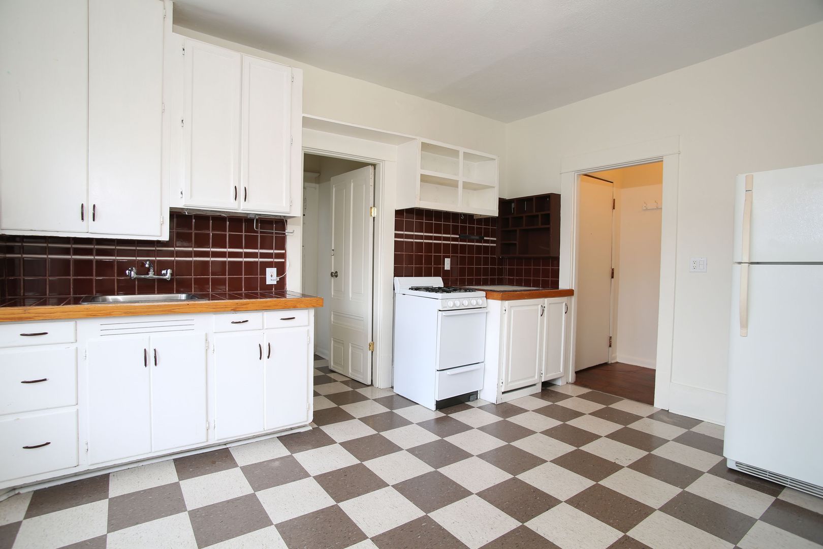 ~The kitchen is very large with plenty of room for a table or desk and plenty of storage in the cabinets that are original to the building.