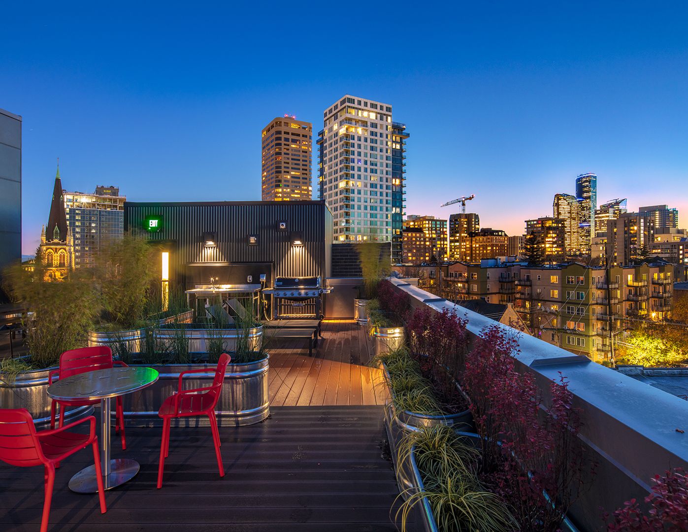 Each home includes a cooktop, microwave, sink, and refrigerator, with many units featuring large windows that bring in abundant natural light while maintaining privacy with built-in window shades. When you want to unwind, head up to the rooftop deck and take in sweeping city and mountain views while grilling or relaxing above the neighborhood.