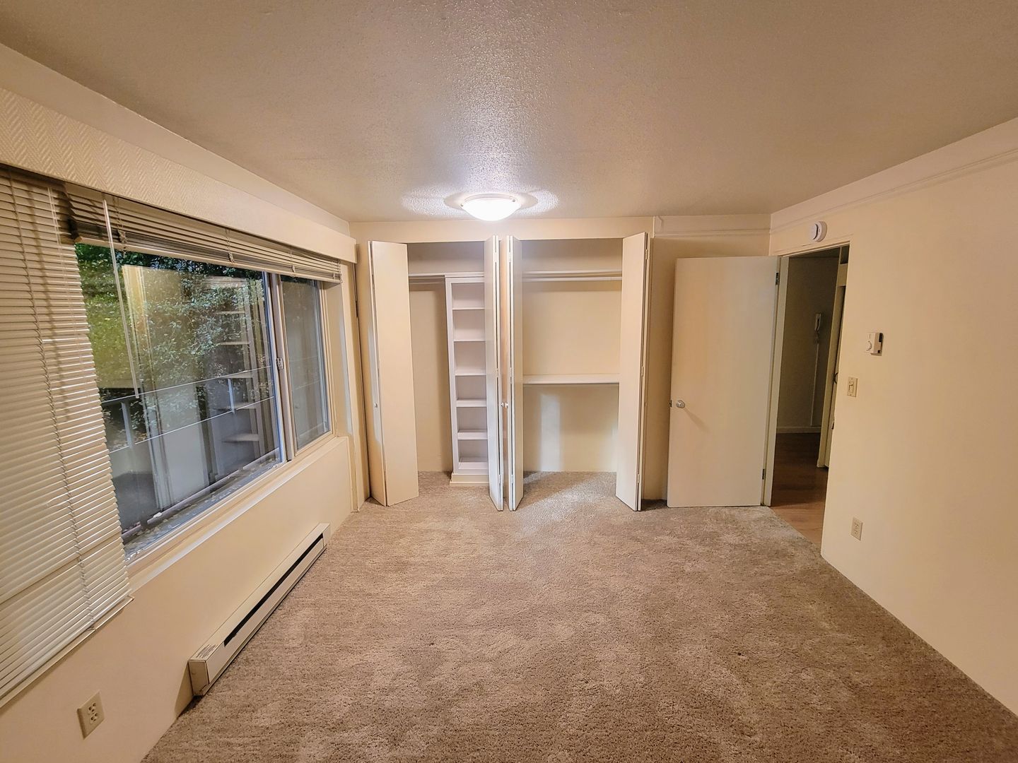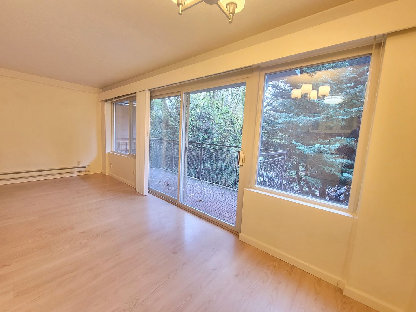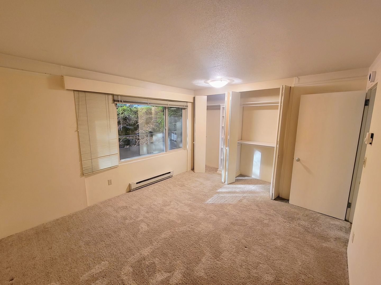 Spacious 1bed/1bath (approx 750sf) apartment available now. Big windows in living space and bedrooms + a spacious deck, overlooking greenbelt - nothing but trees out of every window! Lots of in-unit storage (multiple large closets), laminate flooring throughout living areas and carpet in the bedroom. Clean and bright laundry room on-site, right outside the elevator for easy access.