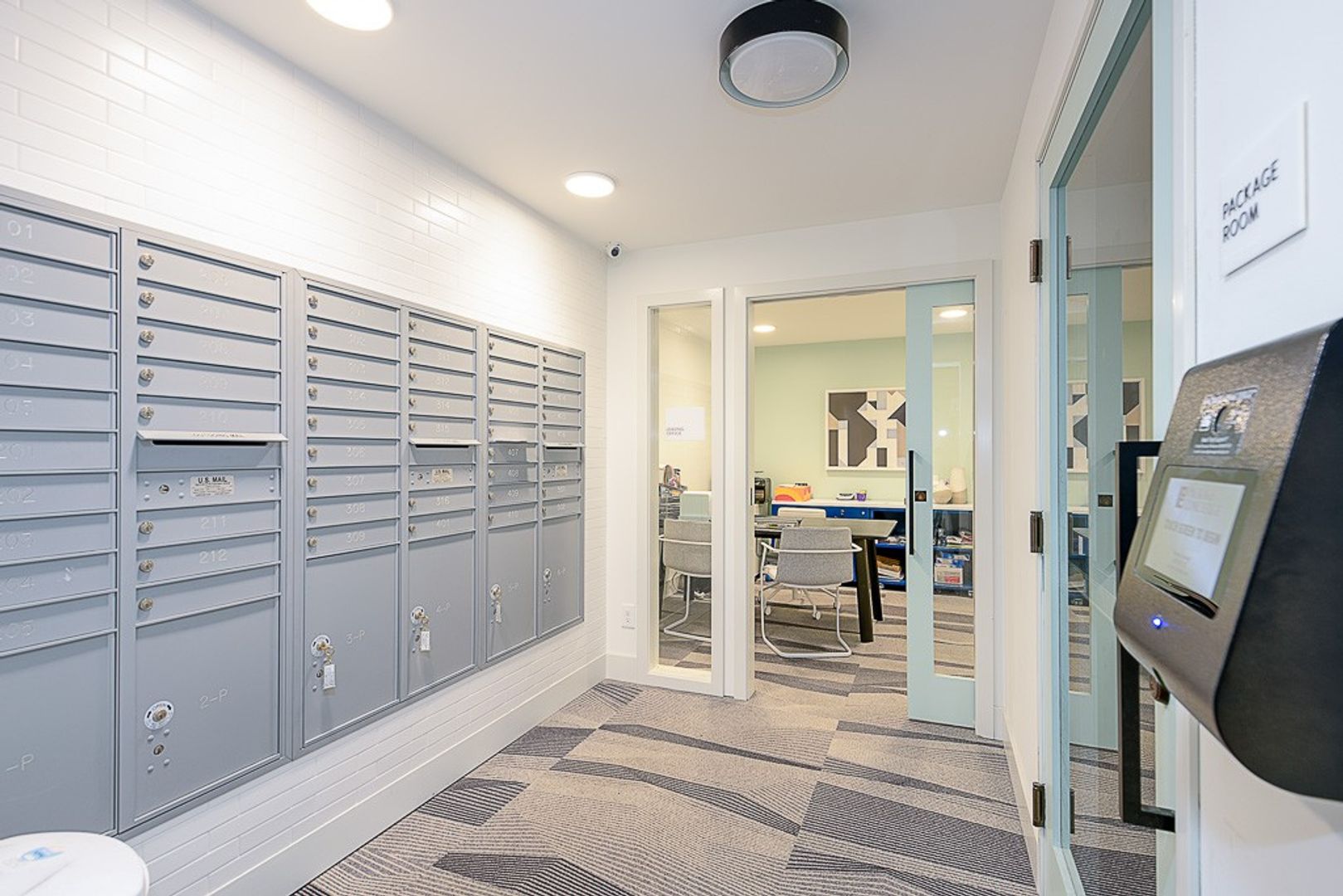 • Secured Package Room (kiosk access/notification system)