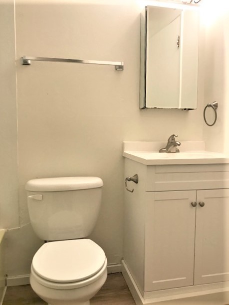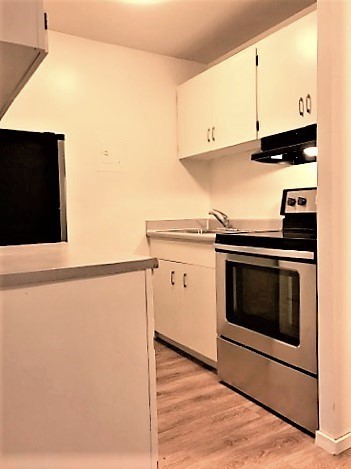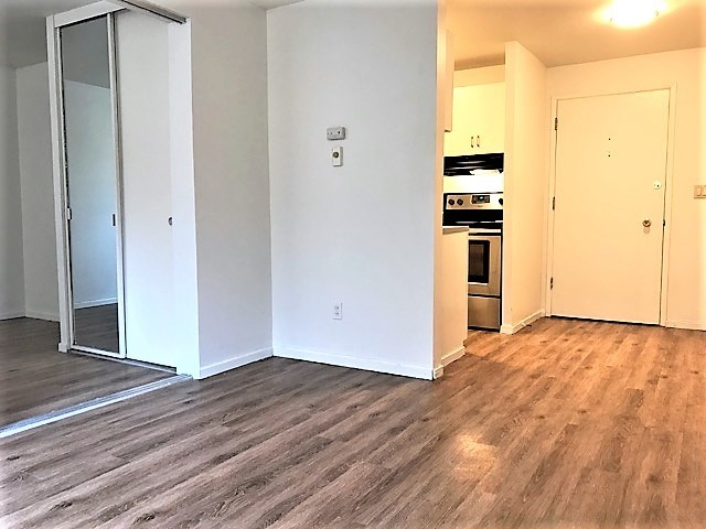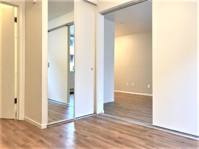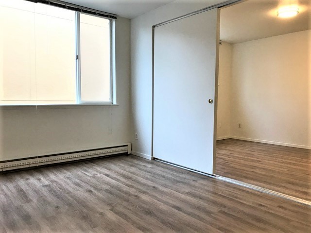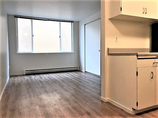 Bring your rugs! This unit has wood finished flooring, plenty of storage and a spacious eating area off the kitchen, living room and bedroom, and a wall of windows facing North.