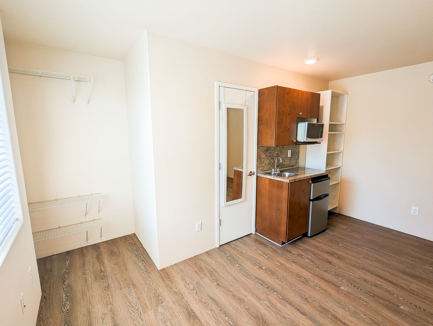 Apartment 558 is right outside a common kitchen with a stove/oven & laundry facility. This corner unit overlooks Downtown Redmond with a large south facing window for plenty of sun!