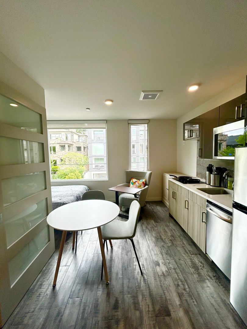 This unit is a bright studio apartment with large east-facing windows. Your new home features a murphy bed, kitchenette with modern finishes, in-unit laundry, and plank flooring! This apartment comes fully furnished with toiletries, complete bedding and cooking set.