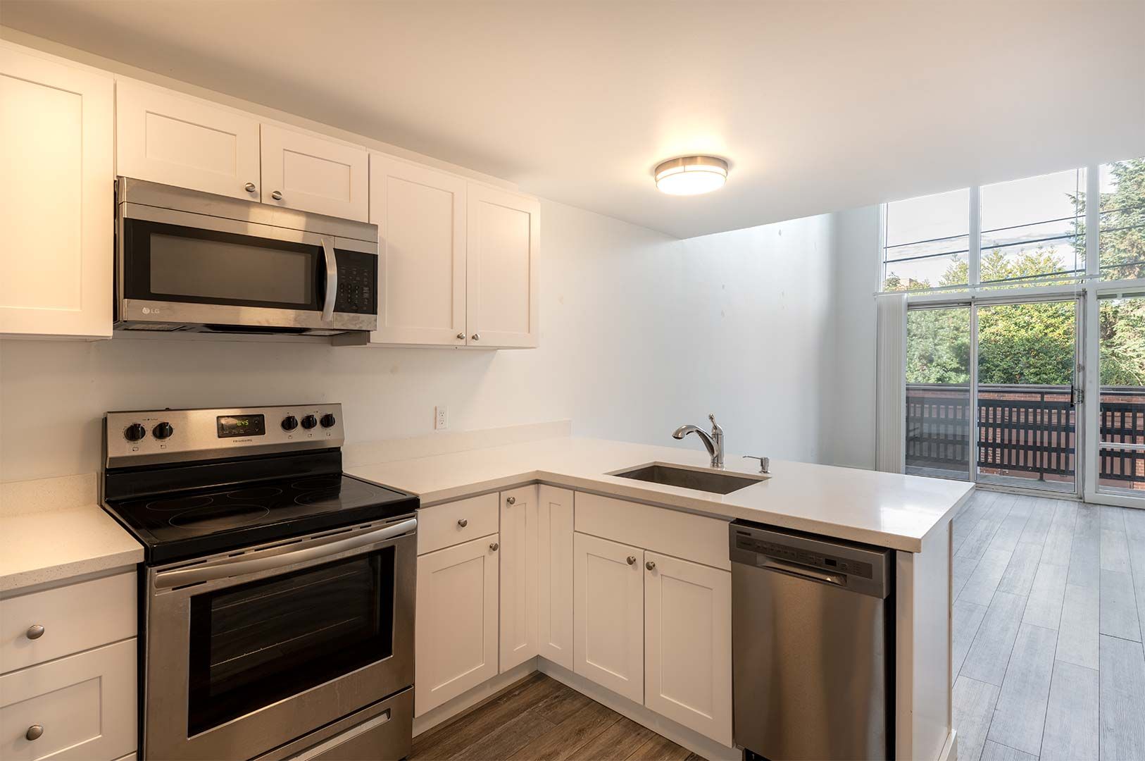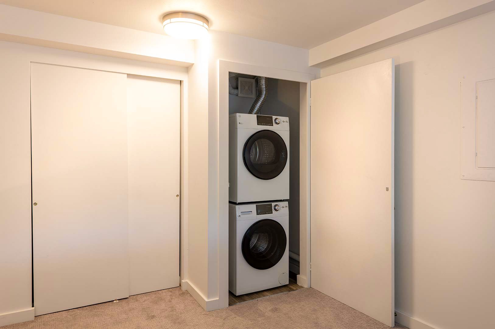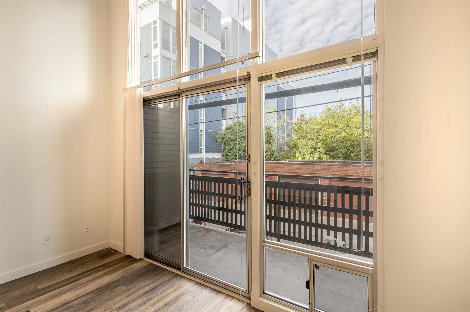 Large open living room and kitchen feature vinyl plank flooring, vaulted ceiling, floor-to-ceiling windows and modern appliances & finishes. Loft style bedroom has a fully renovated bathroom and front loading washer & dryer.