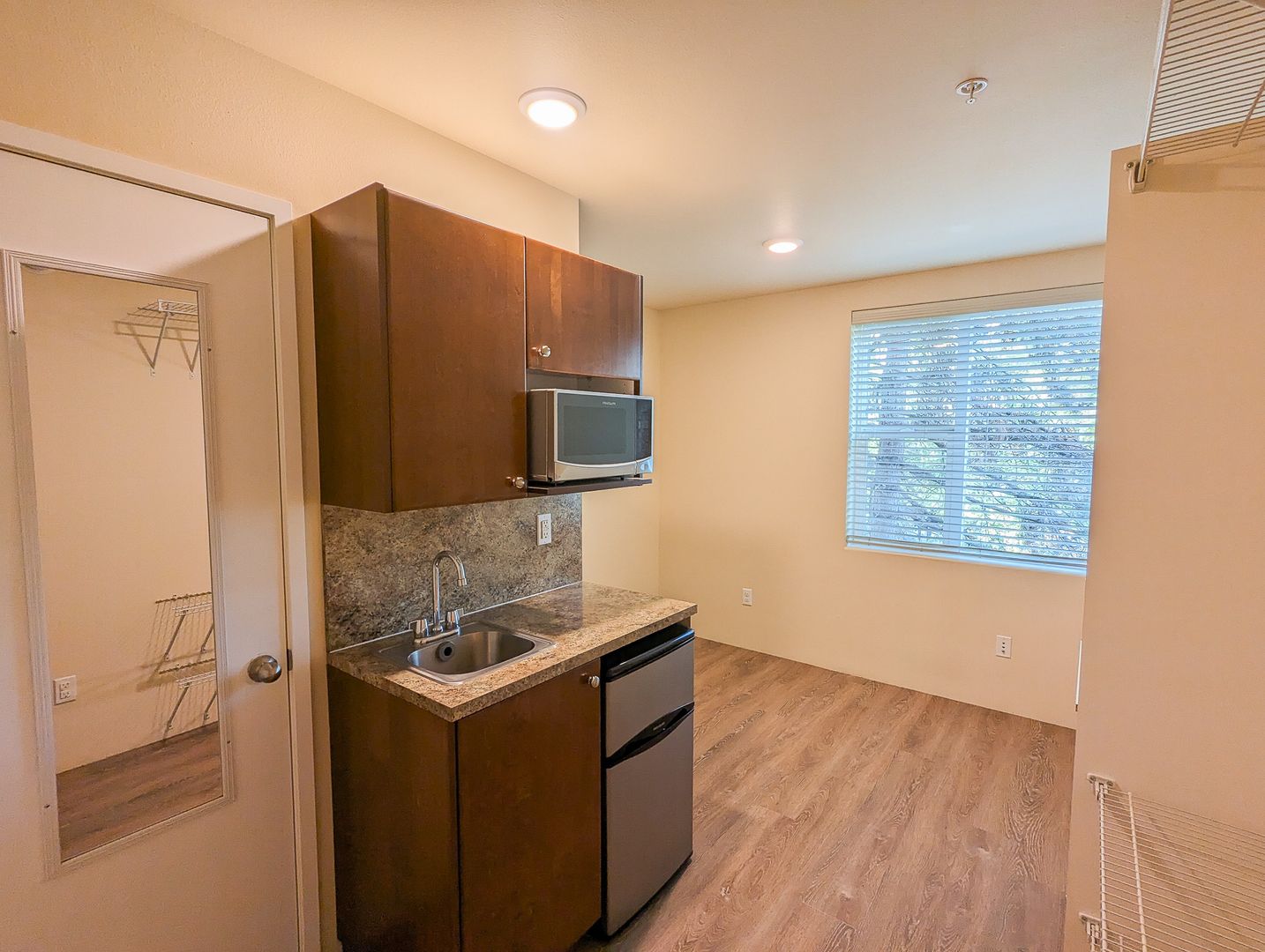 Apartment 454 blends modern convenience with a warm, inviting atmosphere. Relax in your sunlit space with north-facing windows that keep you cool on warm summer days. Just a short walk from the shared courtyard, common kitchens, and laundry facilities, everything you need is right at your fingertips. Or, enjoy your private convenience center for quick meals.